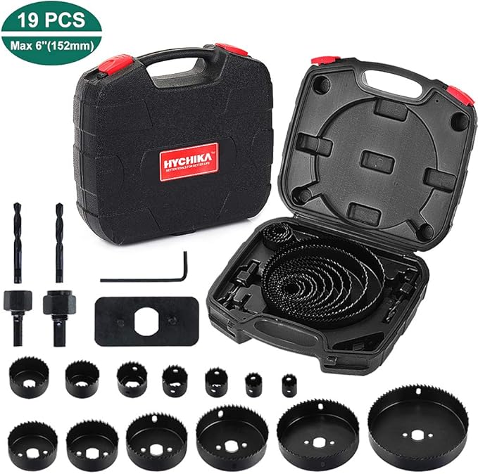 【19 PCS ACCESSOIRES】- Le kit de scie HYCHIKA comprend 2x mandrins, 2x forets, 1x plaque d’installation, 1x clé hexagonale et 13 lames de scie: 19mm, 22mm, 28mm, 32mm, 38mm, 44mm, 51mm, 64mm, 76mm, 89mm, 102mm, 127mm, 152mm, profondeur de coupe maxi de 25mm. Une variété de tailles pour répondre à vos besoins quotidiens.- 【HAUTE QUALITÉ Et SÉCURITÉ】- Acier au carbone traité thermiquement. haute performance, protection contre la rouille et longue durée de vie. La conception spéciale des engrenages rend le trou plus précis. Dents en acier à grande vitesse pour des coupes rapides et propres. Approprié pour le bois normal, panneau mince de PVC, plastique.