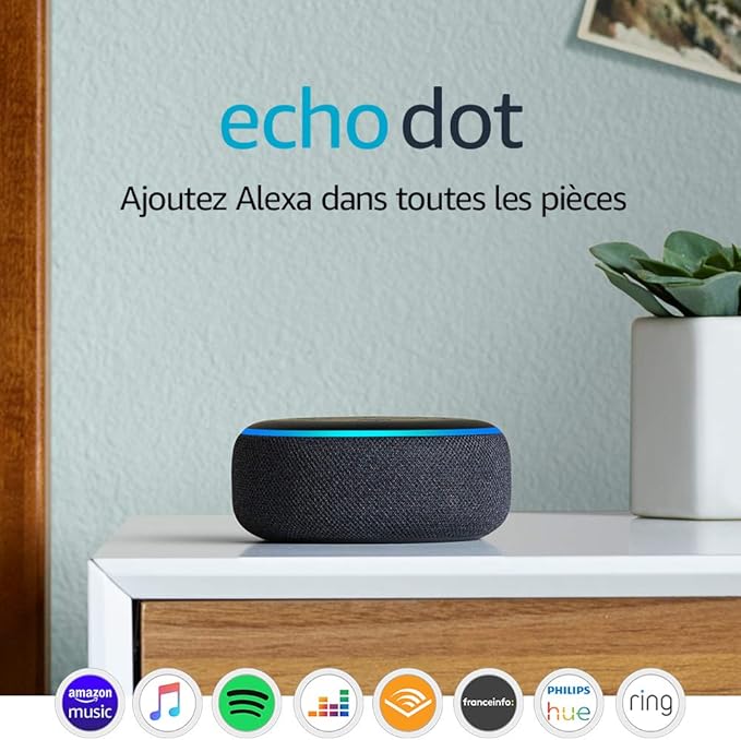 - Un son amélioré, plus puissant : jumelez votre Echo Dot avec un second Echo Dot (3ème génération) pour un son stéréo riche. Écoutez de la musique dans toute votre maison avec des appareils Echo compatibles dans différentes pièces.