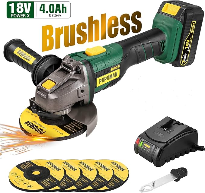 - 【24 Mois de Garantie】1*POPOMAN Sans brosse Meuleuse angulaire , 1x chargeur rapide , 1xBatterie de 18V 4.0Ah , 1 × poignée latérale anti-vibration , 5 x Roues de Meulage , 1 × clef à molette , 1 × protège-meule 1 × manuel de l’utilisateur et 1 × carte de garantie.