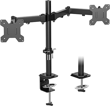 - Support de table pour bras double joint 360 ° – Ce Support Ecran PC permet de monter deux écrans côte à côte pour un espace de travail commode. Il est capable de contenir deux écrans de 15″ à 27″ avec une capacité de charge maximale de 8 kg par bras. La conception à double bras articulé ajoute une stabilité et une flexibilité supplémentaires