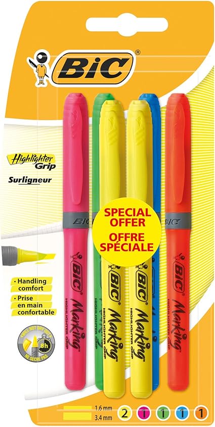 - Les surligneurs BIC Highligther Grip sont dotés d’un grip en caoutchouc rainuré, pour un tracé confortable et toujours bien calibré